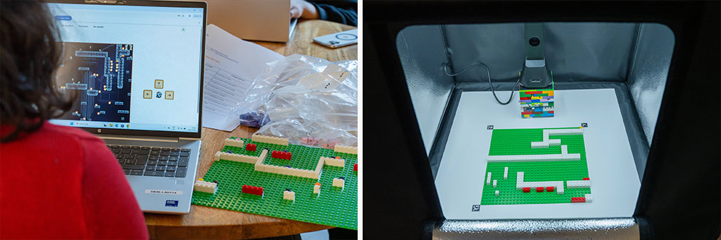 La première partie de l’activité consiste à réaliser leur niveau de jeu sur une plaque de construction avec des pièces de lego. Chaque plaque représente une pièce qui elle-même symbolise soit des plateformes, stables ou mouvantes, soit des pièges et des ennemis à éviter, des clefs ou alors des sabliers à récolter. Cette manière de procéder permet aux jeunes de mieux visualiser l’ensemble de la partie du jeu à inventer. Une fois la création physique de la pièce terminée, nos participant-e-s utilisent ensuite un scanner spécial pour numériser cette plaque.